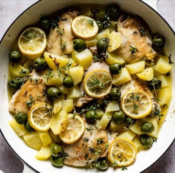 Mediterranean Lemon Chicken is a one-pot complete meal ready in under 1 hour! Tender chicken cooks gently with lemon, potatoes, olives, and loads of savory herbs for tons of flavor. Serve it as a healthy meal on busy weeknights, or give it an elegant spin to serve at your next dinner party