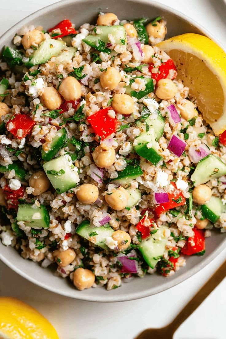 A vibrant, wholesome grain bowl featuring lemony herbed bulgur wheat, colorful roasted vegetables, crispy mini chickpea fritters (inspired by falafel but lighter), and a creamy yogurt-tahini sauce. This bowl is nourishing, fresh, and full of texture — perfect for lunch, dinner, or prep-ahead meals.