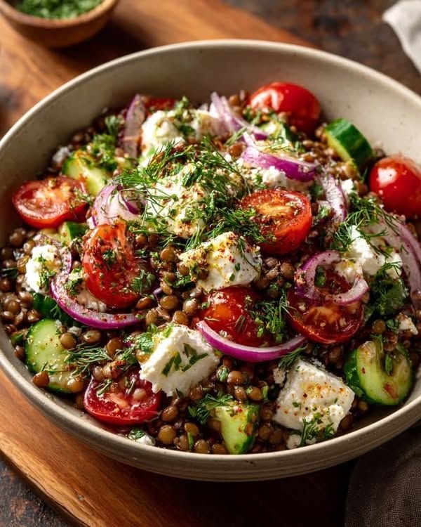This Mediterranean lentil salad is light yet satisfying, made with tender lentils, fresh herbs, crisp vegetables, and a bright lemon–olive oil dressing. It’s rich in plant protein, refreshing in flavor, and perfect as a healthy lunch, side dish, or mezze option.