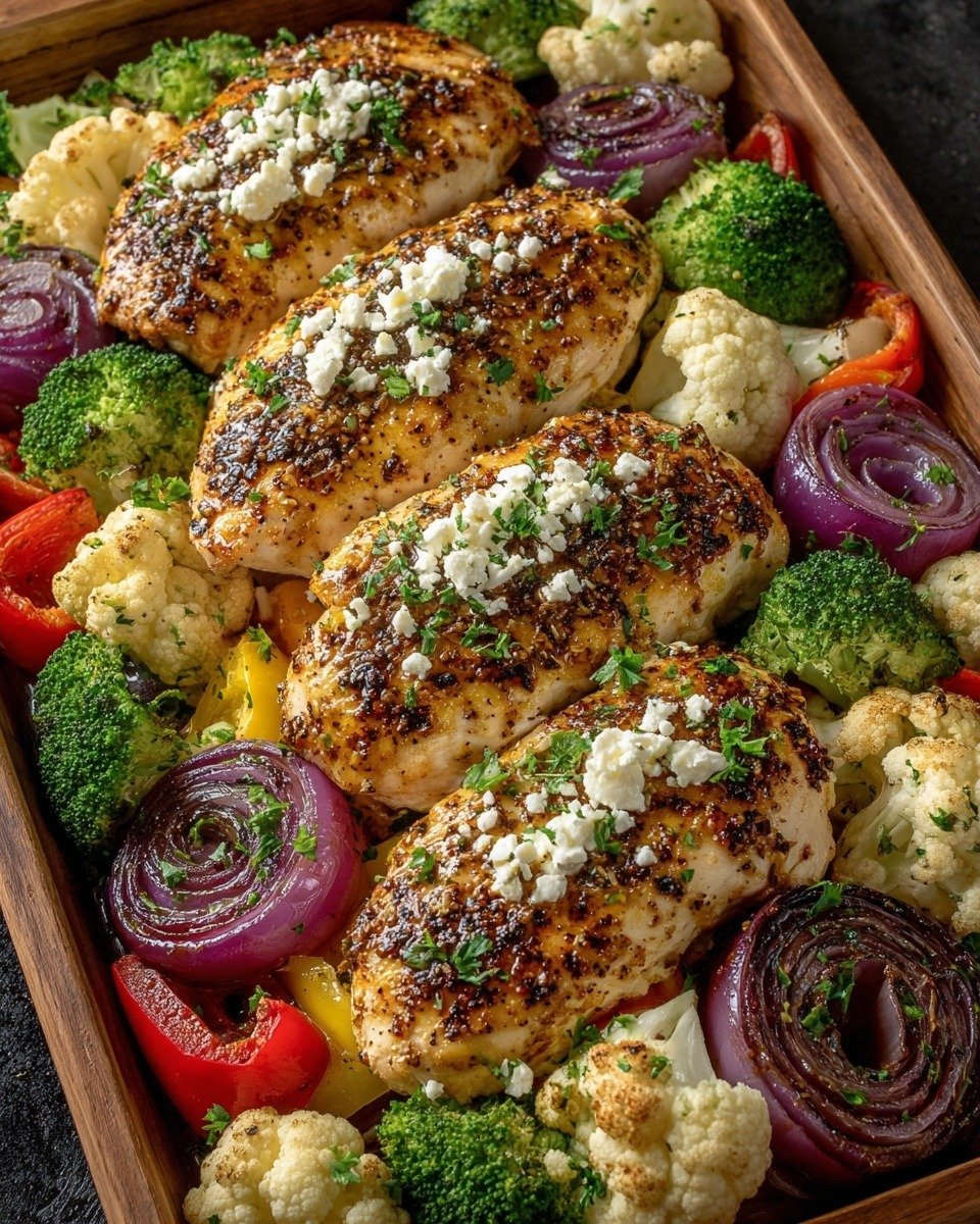Sprinkle crumbled feta and fresh parsley over the chicken and vegetables just before serving.