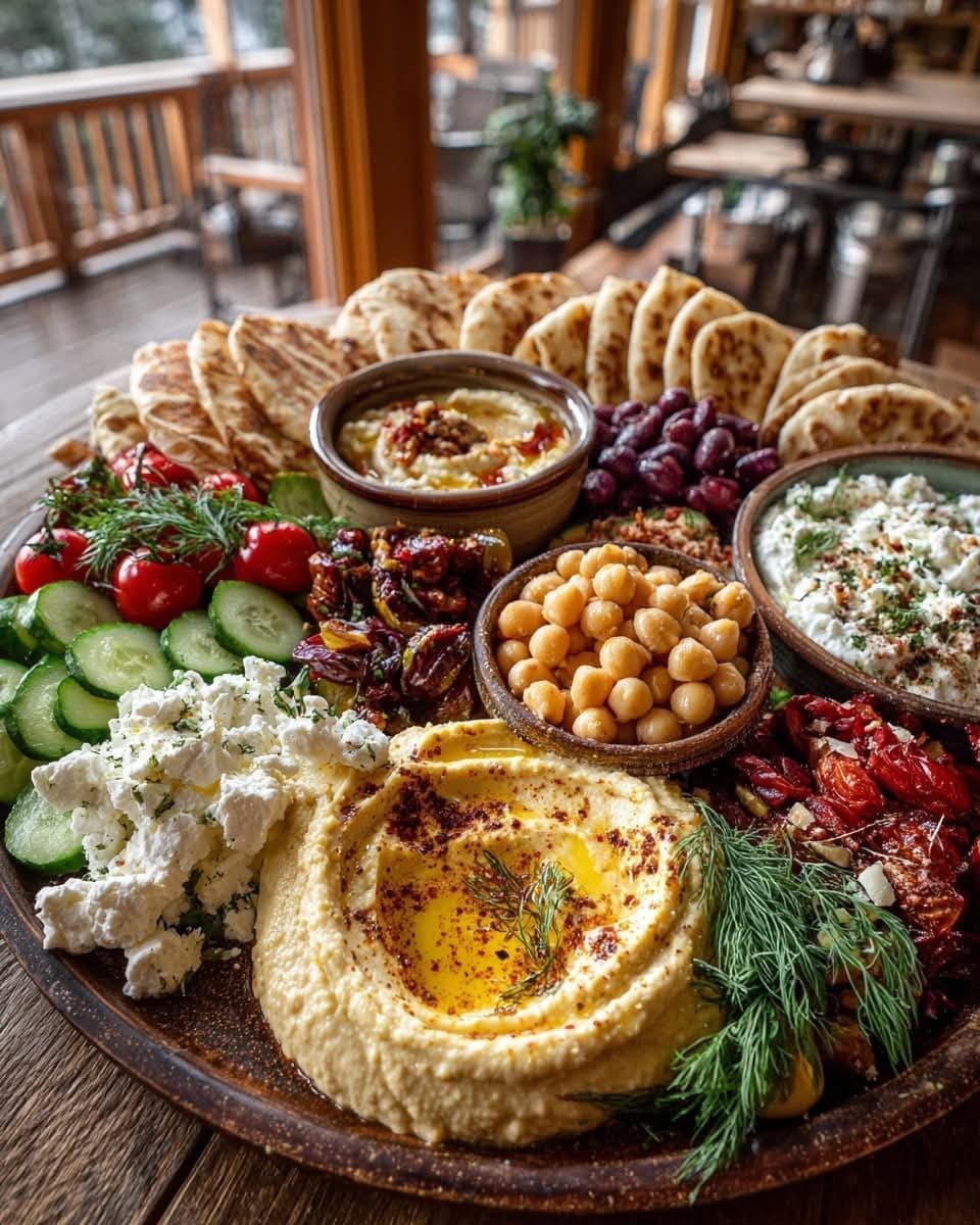 A Mediterranean Mezze Platter is more than just food — it’s a celebration of color, texture, and community. “Mezze” refers to a spread of small dishes meant to be shared, inviting everyone to graze, dip, and enjoy at their own pace. This version brings together three classic dips — creamy hummus, tangy whipped feta, and refreshing tzatziki — surrounded by an assortment of fresh vegetables, warm pita, briny olives, and savory bites.