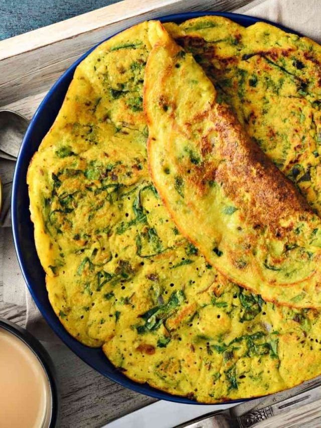 Soft yet lightly crisp pancakes made from soaked yellow moong dal blended with spinach, olive oil, garlic, and Mediterranean herbs.Think of them as a Mediterranean-Indian fusion: nutritious, filling, and easy to digest.