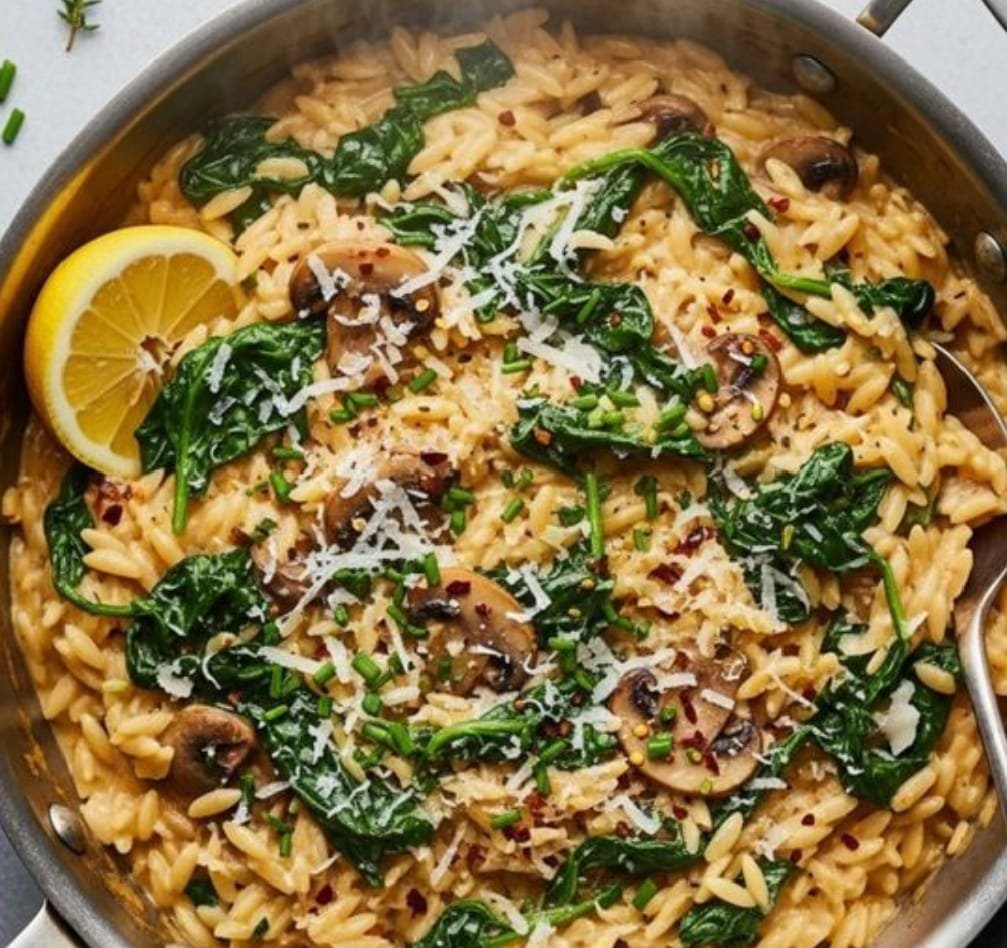 This one-pan dish brings together tender orzo pasta, earthy mushrooms, and fresh spinach in a light Mediterranean-inspired sauce. With olive oil, garlic, lemon, and a sprinkle of feta, it’s comforting yet wholesome — perfect for a weeknight meal.