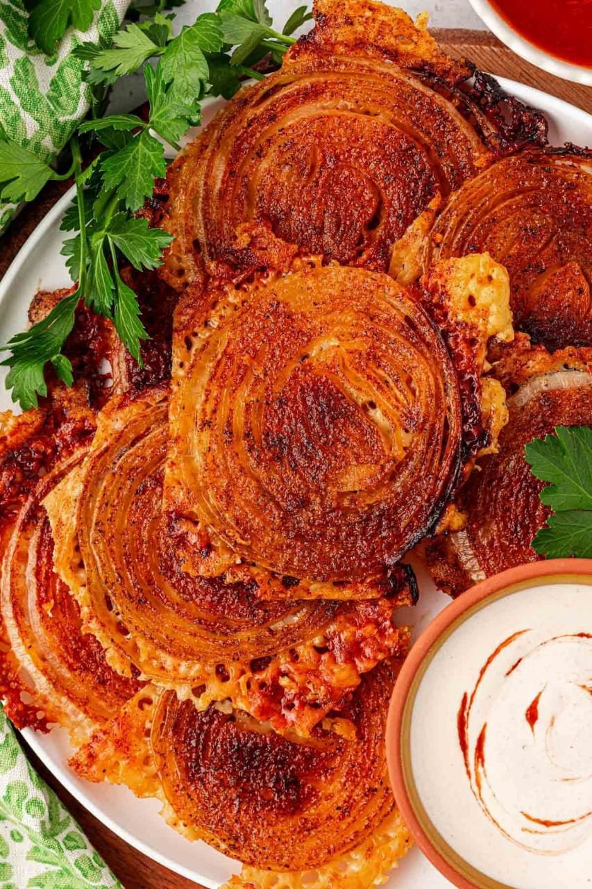 These Mediterranean onion rings chips are a lighter, crispier take on the classic snack. Instead of a heavy batter, the onions get coated in a simple mixture of olive oil, herbs, spices and a light crumb that bakes into a thin, crunchy shell. The flavor is a mix of oregano, paprika, garlic and salt, with just enough olive oil to help everything stick and crisp. The result tastes like a cross between onion rings and chips — airy, savory and easy to eat. They work as a quick appetizer, a snack for movie night or a topping for salads and sandwiches. They cook fast, use pantry ingredients and feel much lighter than deep-fried versions. You can bake them, air fry them or pan-toast them depending on what you prefer. Once you start making them, you’ll probably end up doing it often because they hit that perfect balance of crunchy, salty and herby.