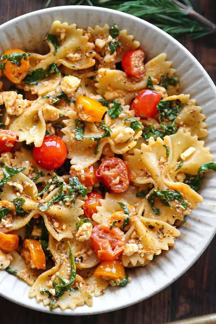 Mediterranean Pasta with Feta Cheese, Spinach, Garlic, and Cherry Tomatoes