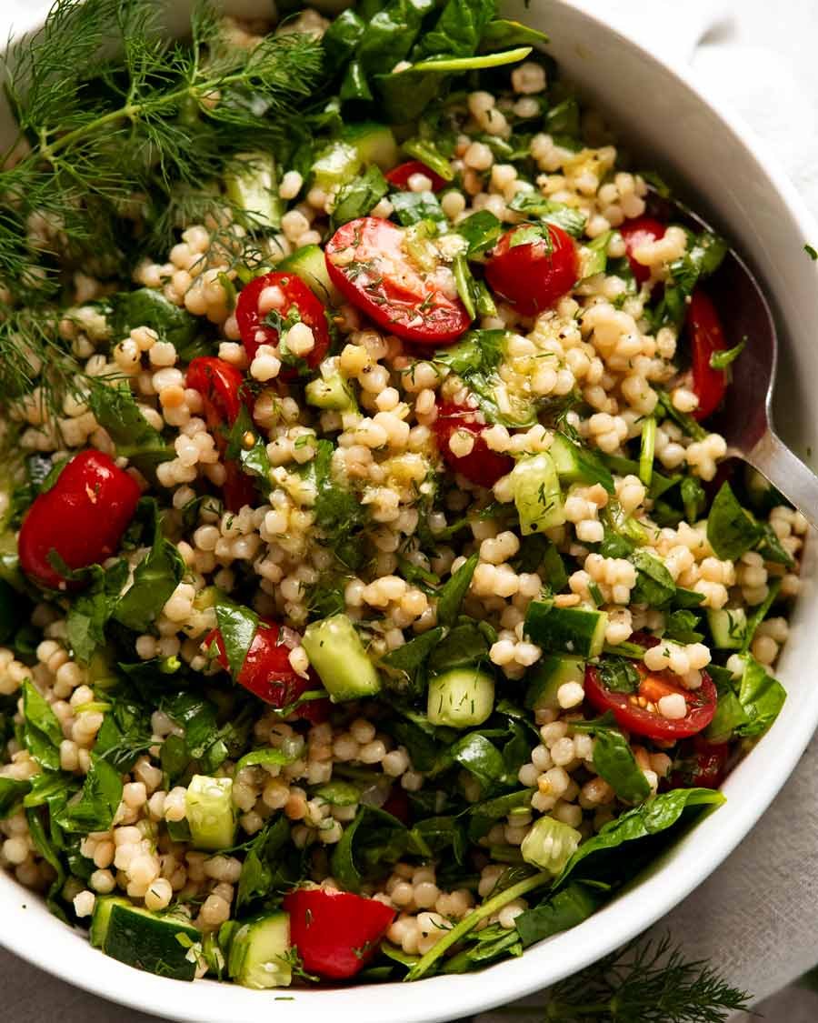 This Pearl Couscous Salad is fabulously addictive! Tender, flavour infused beads of couscous tossed with spinach, tomato, cucumber, herbs and a fresh lemon dressing. Summer in a bowl!