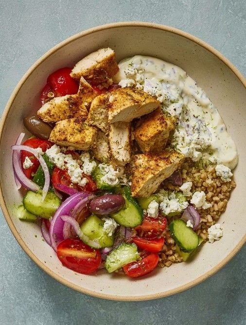 This bowl features grilled lemon-herb chicken, protein-packed quinoa, roasted Mediterranean vegetables, chickpeas, and a creamy tahini-lemon dressing. It’s balanced, high-protein, and full of antioxidants, perfect for weight-loss, glowing skin, and sustained energy.