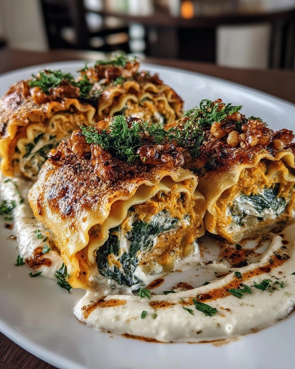Mediterranean Pumpkin & Spinach Lasagna Rolls with Brie & Walnuts