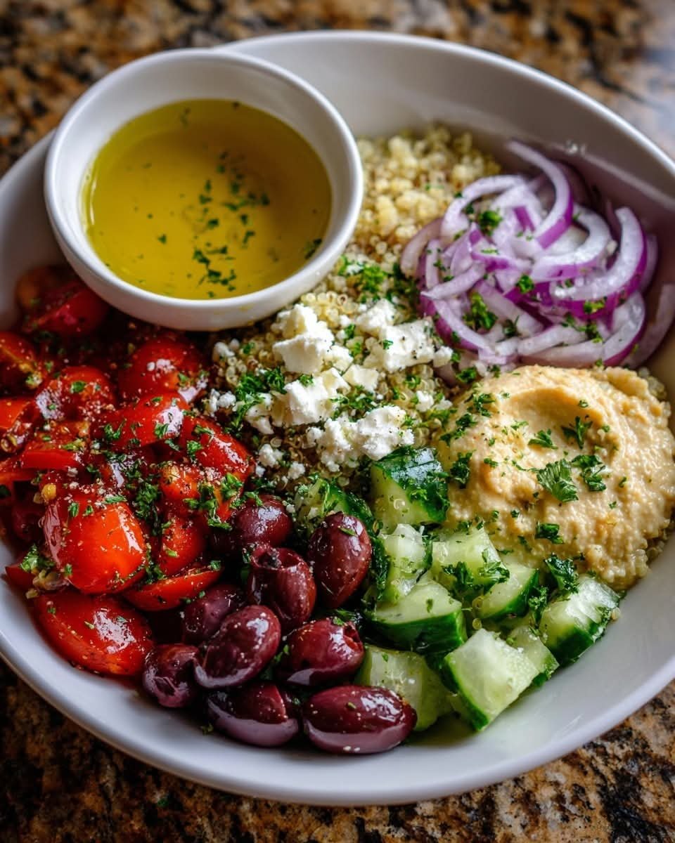 This wholesome bowl features fluffy quinoa topped with crisp cucumbers, juicy tomatoes, briny olives, tangy feta, chickpeas, and creamy hummus — all drizzled with a lemony olive oil dressing. Perfect for lunch, dinner, or meal prep!