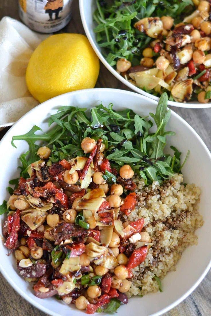 A nourishing Mediterranean bowl made with fluffy quinoa, peppery arugula, chickpeas, sun-dried tomatoes, artichokes, olives, and a lemon–olive oil dressing finished with a light balsamic drizzle.