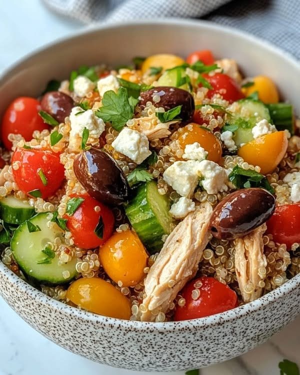 This Mediterranean Quinoa Salad with Chicken and Feta is a vibrant, healthy dish that’s perfect for a light lunch or dinner. Packed with protein, fiber, and fresh veggies, it’s a delicious combination of quinoa, tender grilled chicken, creamy feta, and a medley of Mediterranean flavors. The tangy dressing ties everything together, making this salad not only filling but also refreshing. Whether you’re meal prepping for the week or looking for a quick and satisfying meal, this recipe is sure to impress! It’s easy to make, full of nutrition, and bursting with color and taste.