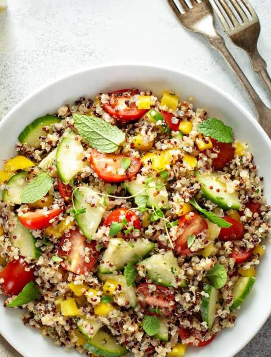 4. Combine: In a large bowl, toss cooled quinoa with veggies, herbs, and feta. Drizzle with dressing and mix well.