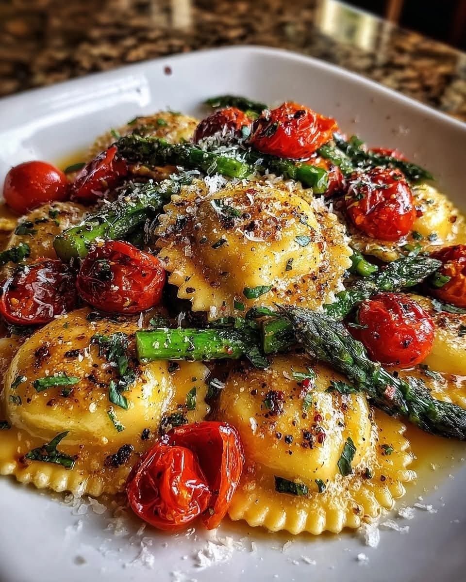 This Mediterranean-inspired ravioli dish is light, fresh, and flavorful, perfect for a quick weeknight dinner or a special meal without the fuss. Tender ravioli is tossed with sweet cherry tomatoes, crisp asparagus, and aromatic garlic, all brought together with herbs and a touch of Parmesan. It’s a 30-minute recipe that feels restaurant-worthy but simple enough for home cooking.