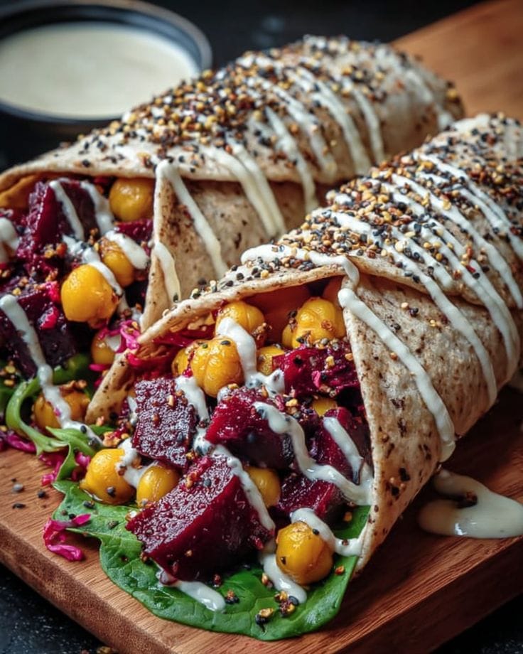 These vibrant wraps are bursting with flavor and color — earthy roasted beetroot, spiced chickpeas, crisp vegetables, and a creamy, nutty tahini dressing, all bundled up in a soft wrap. Packed with plant-based protein, fiber, and Mediterranean-inspired goodness, they make a perfect lunch or light dinner.