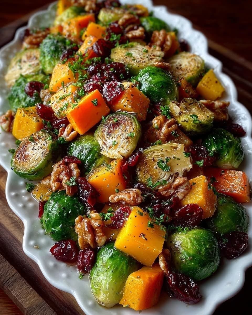 Mediterranean Roasted Brussels Sprouts and Butternut Squash with Maple Walnuts & Cranberries