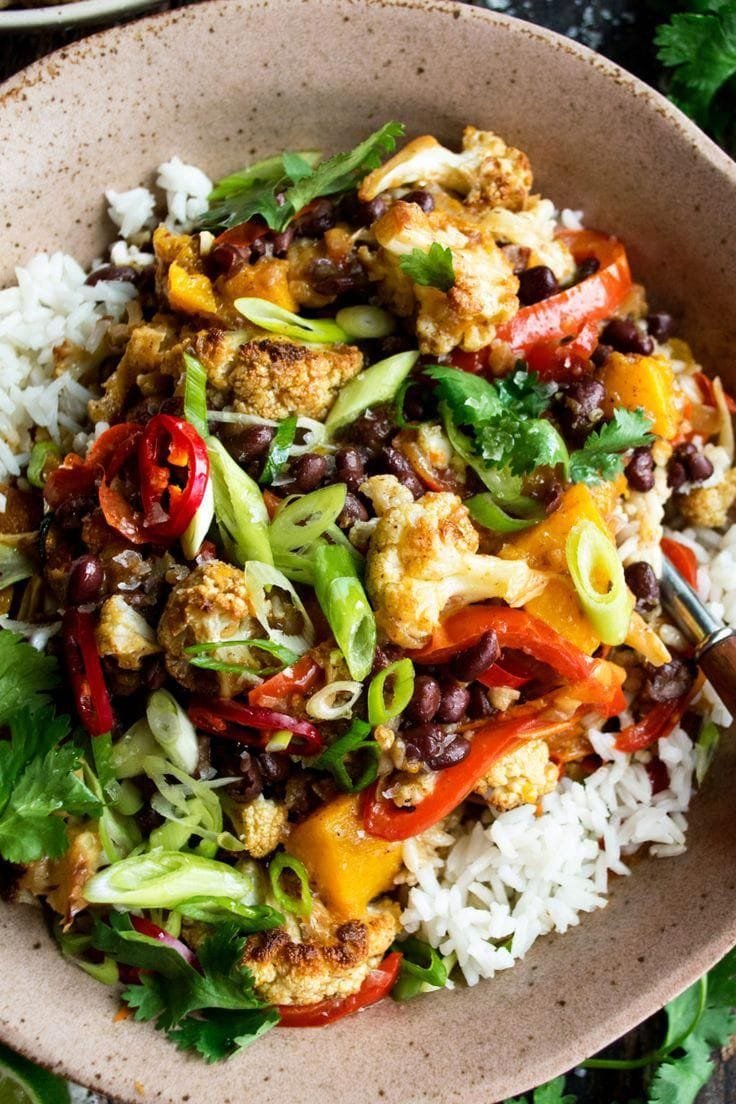 Mediterranean roasted cauliflower bell peppers black beans bowl