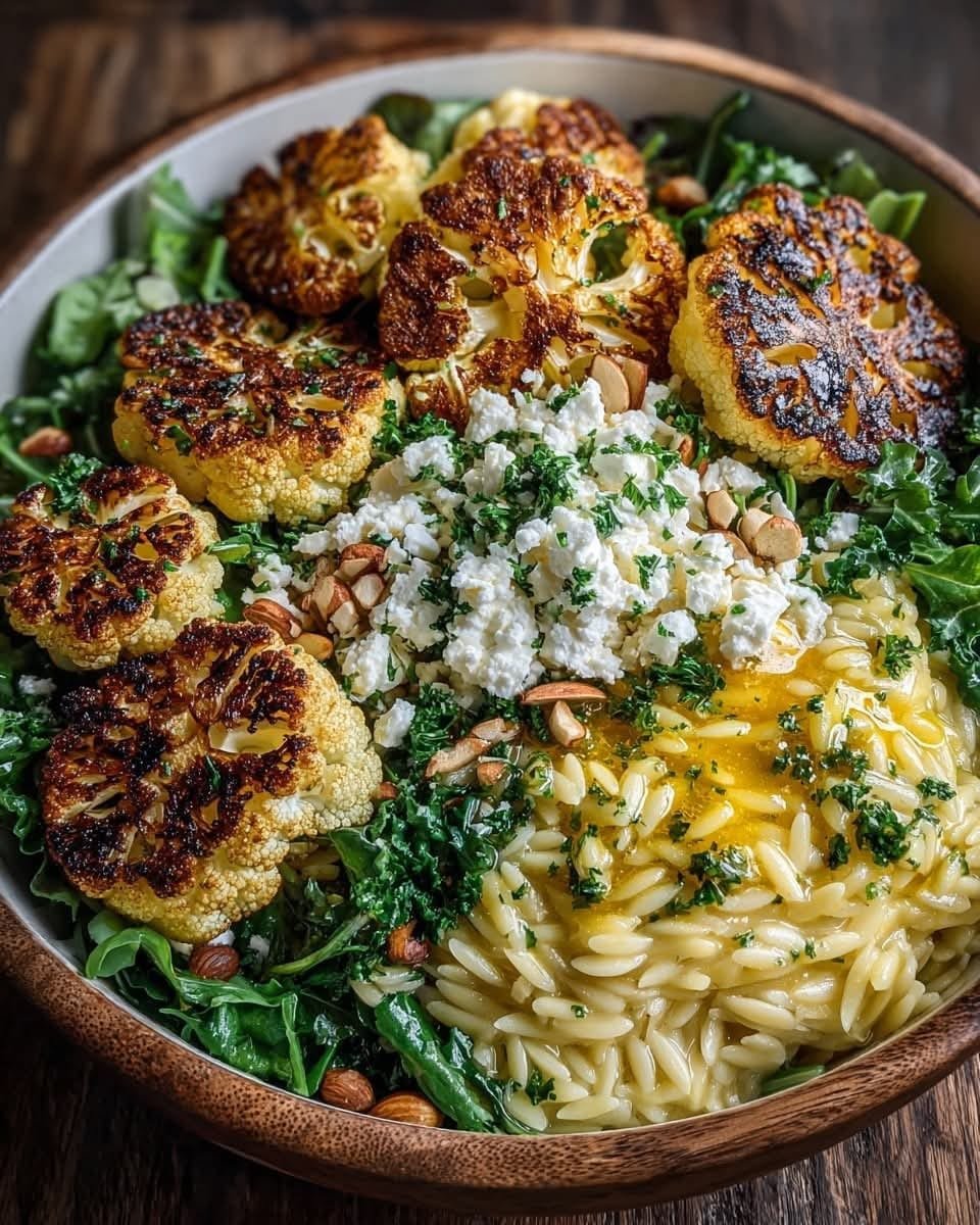This bowl has a nice mix of textures and flavors. The cauliflower adds warmth, the orzo makes it satisfying and the honey-lemon feta dressing brightens everything. If you want a lighter version, a vegan one, or a creamy version, just tell me.