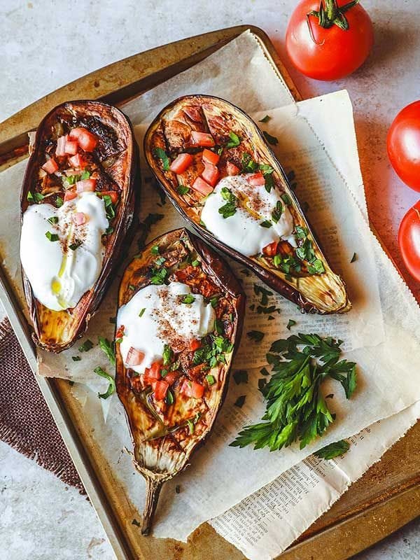 Mediterranean Roasted Stuffed Eggplant with Herbed Yogurt