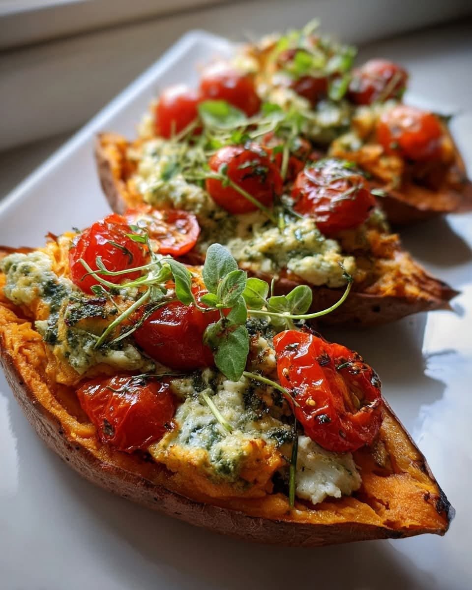 Mediterranean Roasted Sweet Potatoes Stuffed with Ricotta, Cherry Tomatoes & Pesto