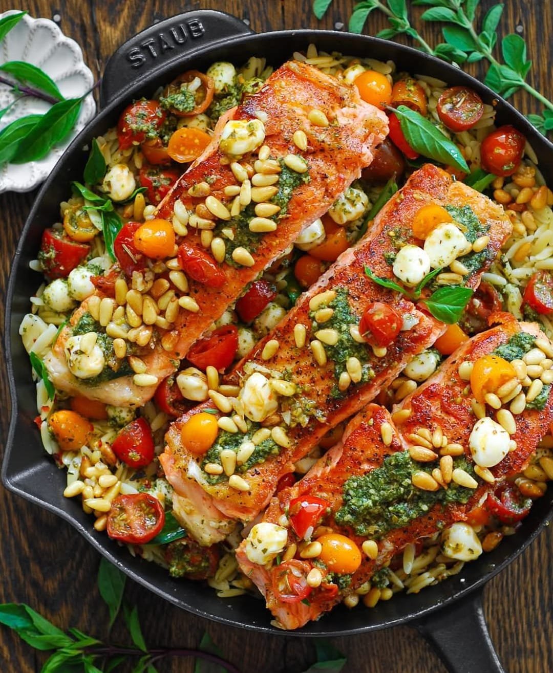 This Mediterranean Salmon Orzo with Basil Pesto is a vibrant and healthy dish that brings together flaky salmon, tender orzo pasta, and a flavorful basil pesto sauce. Packed with fresh vegetables, olives, and feta cheese, this dish is perfect for a light yet satisfying meal. It’s easy to make, full of protein, and bursting with Mediterranean flavors.