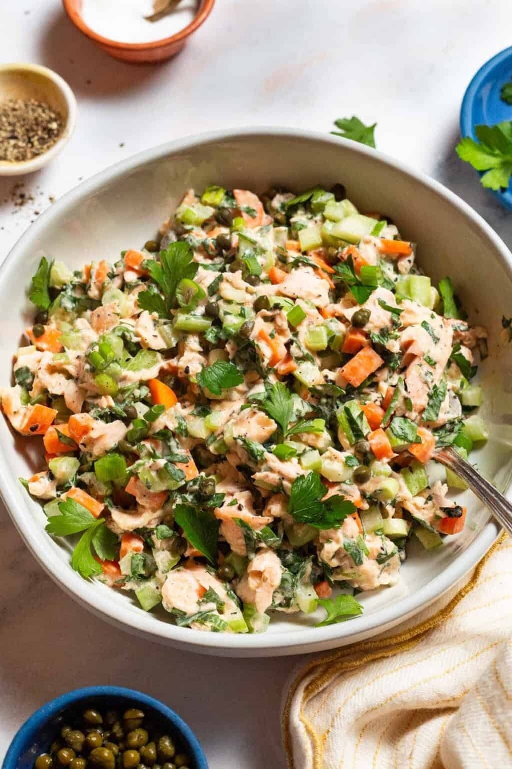 Make the salad. Flake the salmon with your fork and add it to the bowl with the dressing. Add the green onions, celery, carrot, capers, and fresh parsley. Gently mix until well combined.