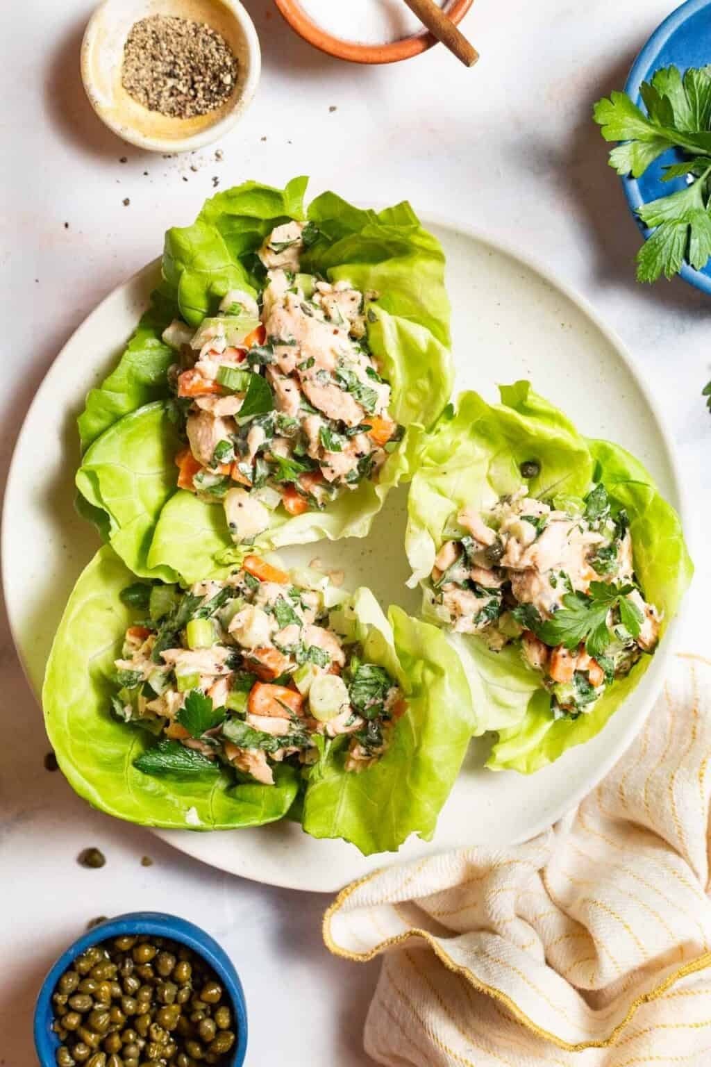 This easy salmon salad recipe swaps mayo for tangy Greek yogurt and Mediterranean flavor-makers like capers, spices, and fresh herbs. Serve with on crostini as an appetizer, or with lettuce cups for a healthy gluten-free dinner.