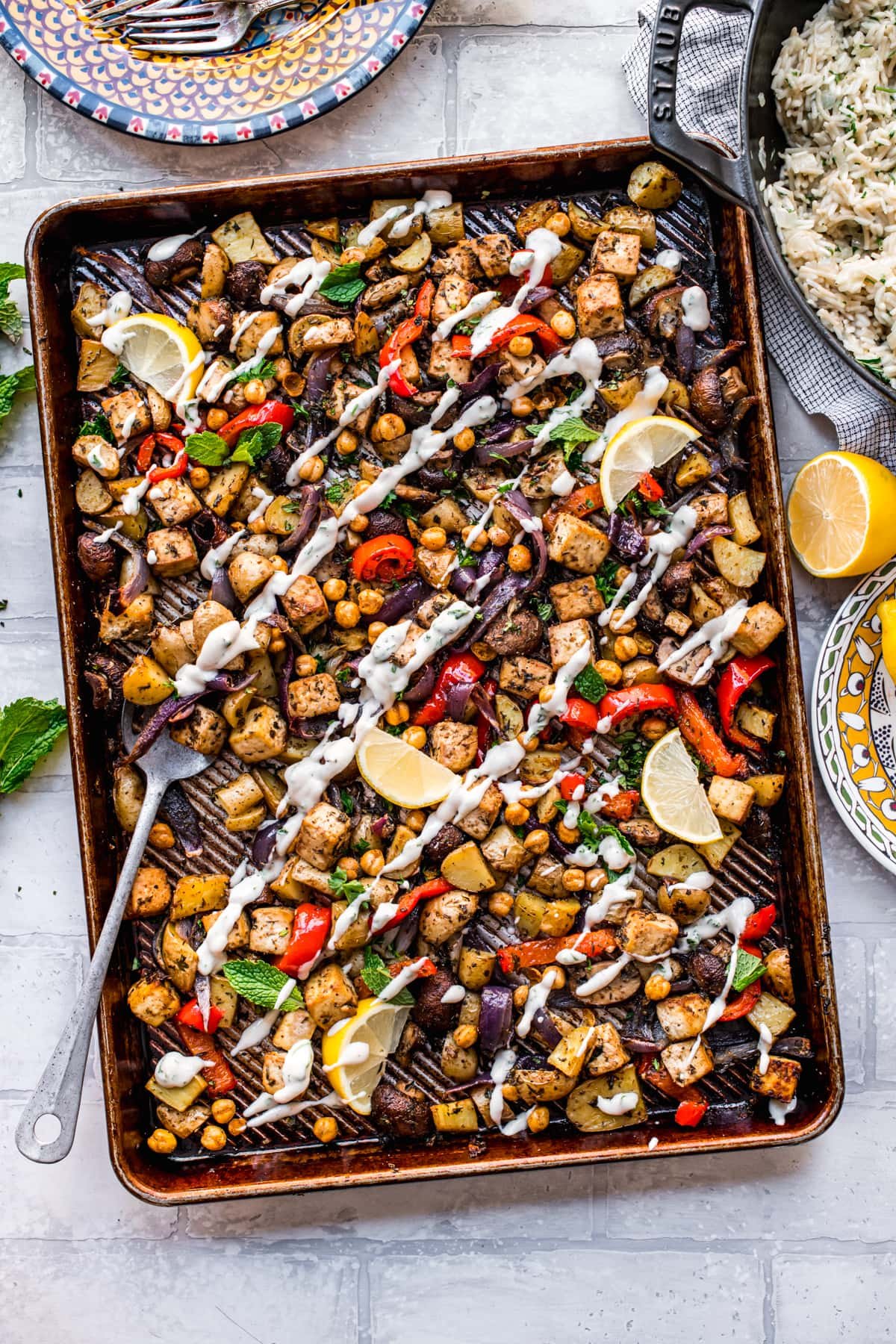 This vegan Mediterranean sheet pan dinner is made with tofu, potatoes, vegetables and a creamy yogurt tahini sauce. It’s a delicious, flavorful weeknight dinner ready in about an hour.