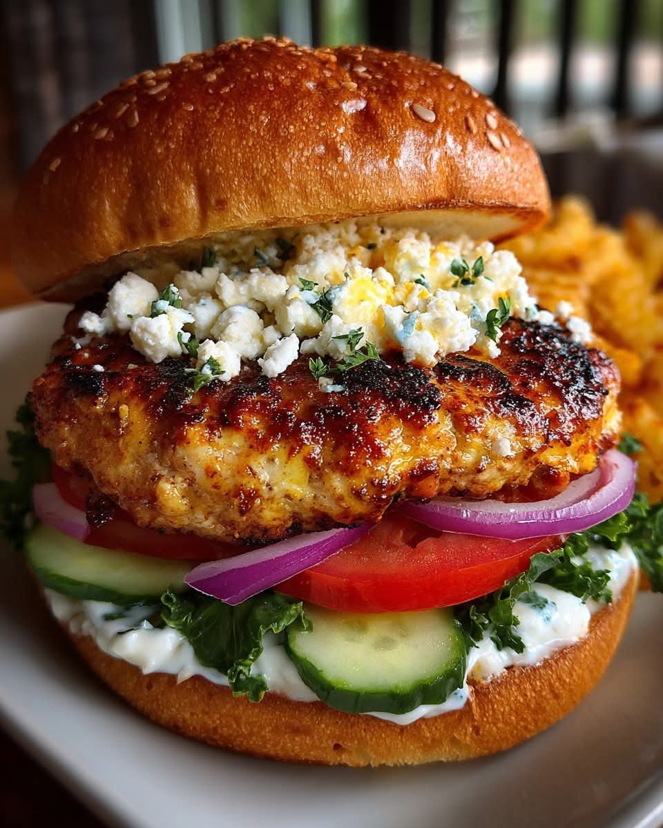 Mediterranean Smash Chicken Burgers with Creamy Garlic Yogurt Sauce & Fresh Feta Crumble