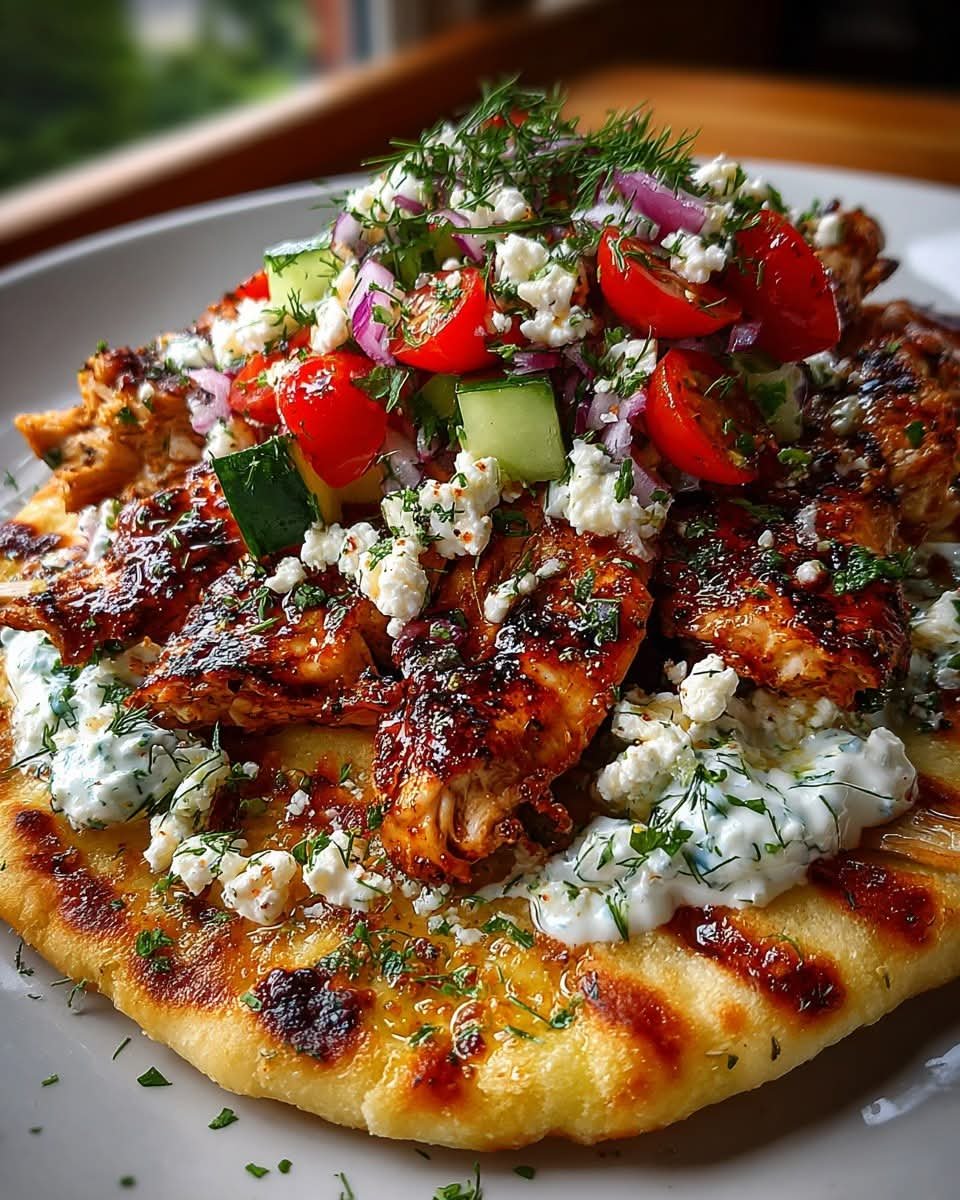 Mediterranean Spiced Chicken Flatbread with Creamy Dill Feta is a vibrant, restaurant-style dish featuring juicy spiced chicken, warm flatbread, fresh vegetables, and a rich, tangy dill feta sauce. The chicken is marinated with classic Mediterranean spices like paprika, garlic, oregano, and lemon, then layered over soft flatbread with crisp toppings and a creamy herb sauce.