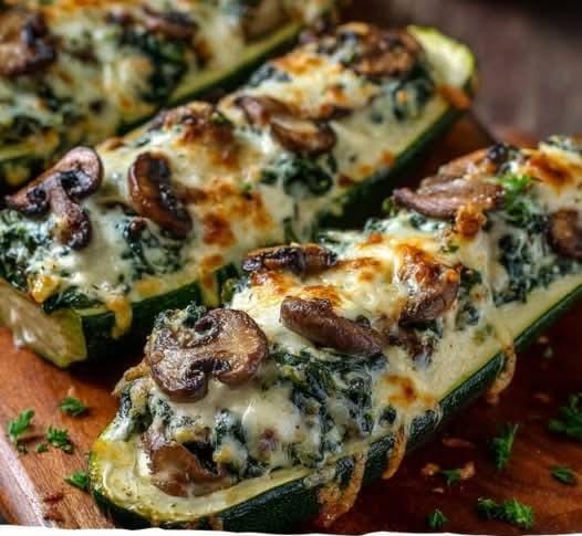 Mediterranean Spinach, Mushroom & Cheese Stuffed Zucchini Boats