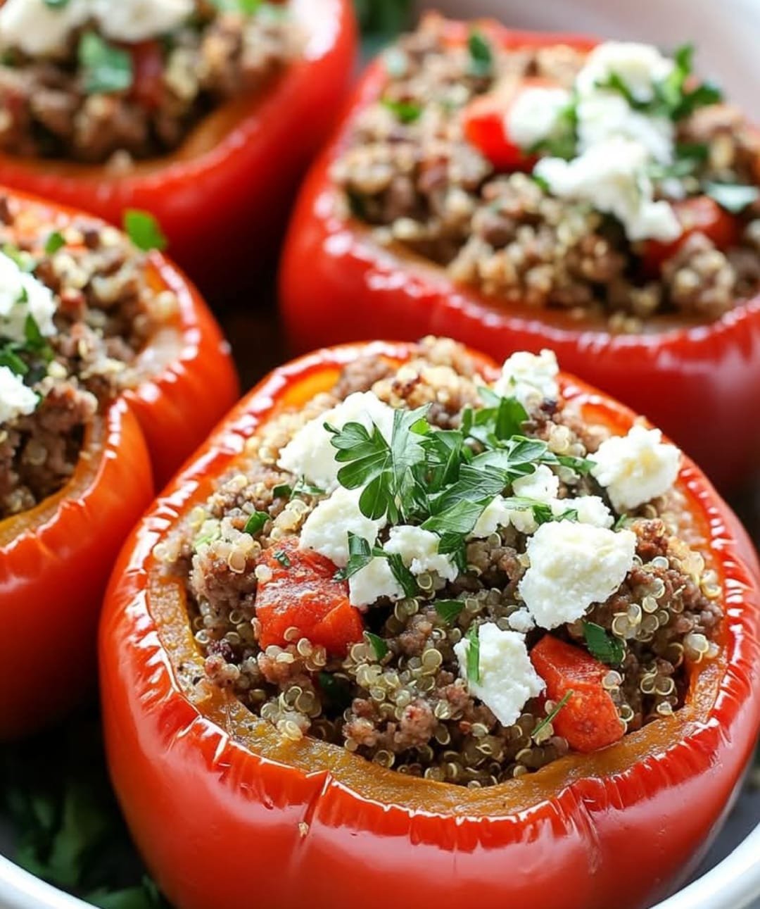 Mediterranean Stuffed Bell Peppers are a wholesome and flavorful dish filled with a nutritious blend of quinoa (or rice), chickpeas, fresh vegetables, and aromatic herbs. These vibrant peppers are baked to perfection and topped with creamy feta cheese for a delicious balance of textures and flavors. They are vegetarian, gluten-free, and packed with protein, fiber, and Mediterranean spices. Serve them as a main dish or a side with grilled meats or fish.
