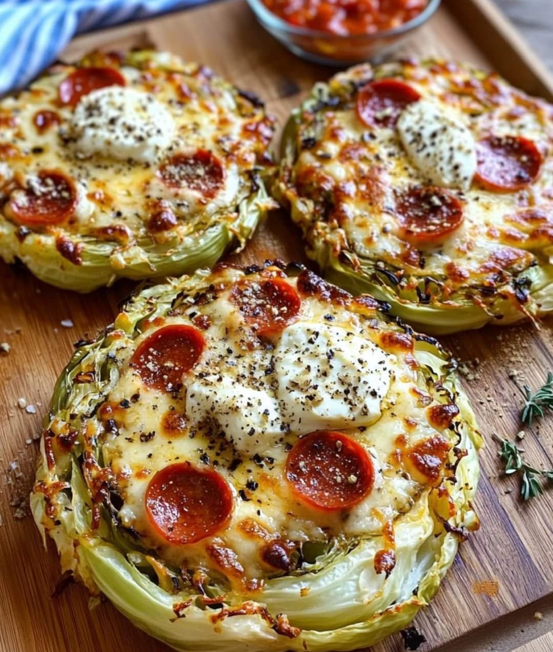 Add Toppings: After the cabbage steaks are roasted, remove them from the oven and top each steak with marinara sauce, shredded mozzarella, and mini pepperonis. Sprinkle with dried oregano and chili flakes if desired.