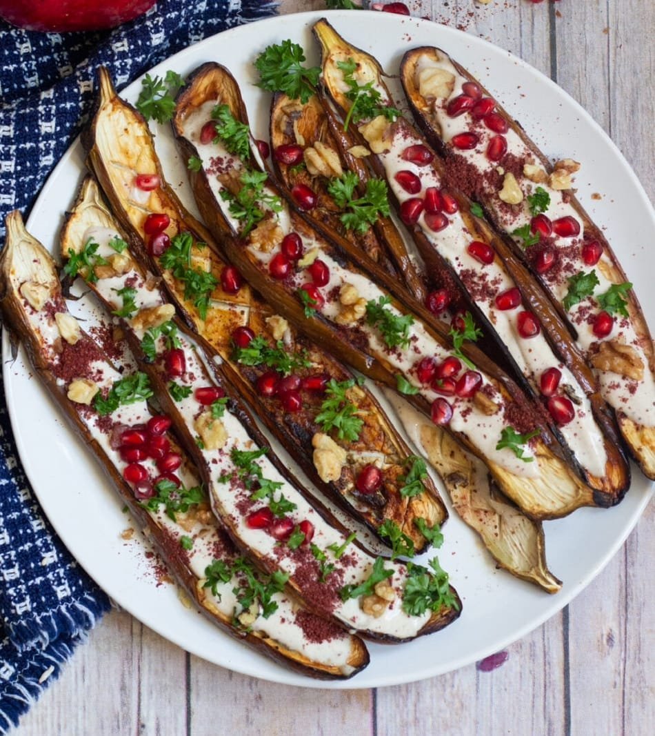 This is a great Mediterranean eggplant recipe to always keep on hand. Perfectly roasted eggplant is served with a stunning tahini yogurt sauce and pomegranate arils. It’s perfect as a side dish or an impressive appetizer!