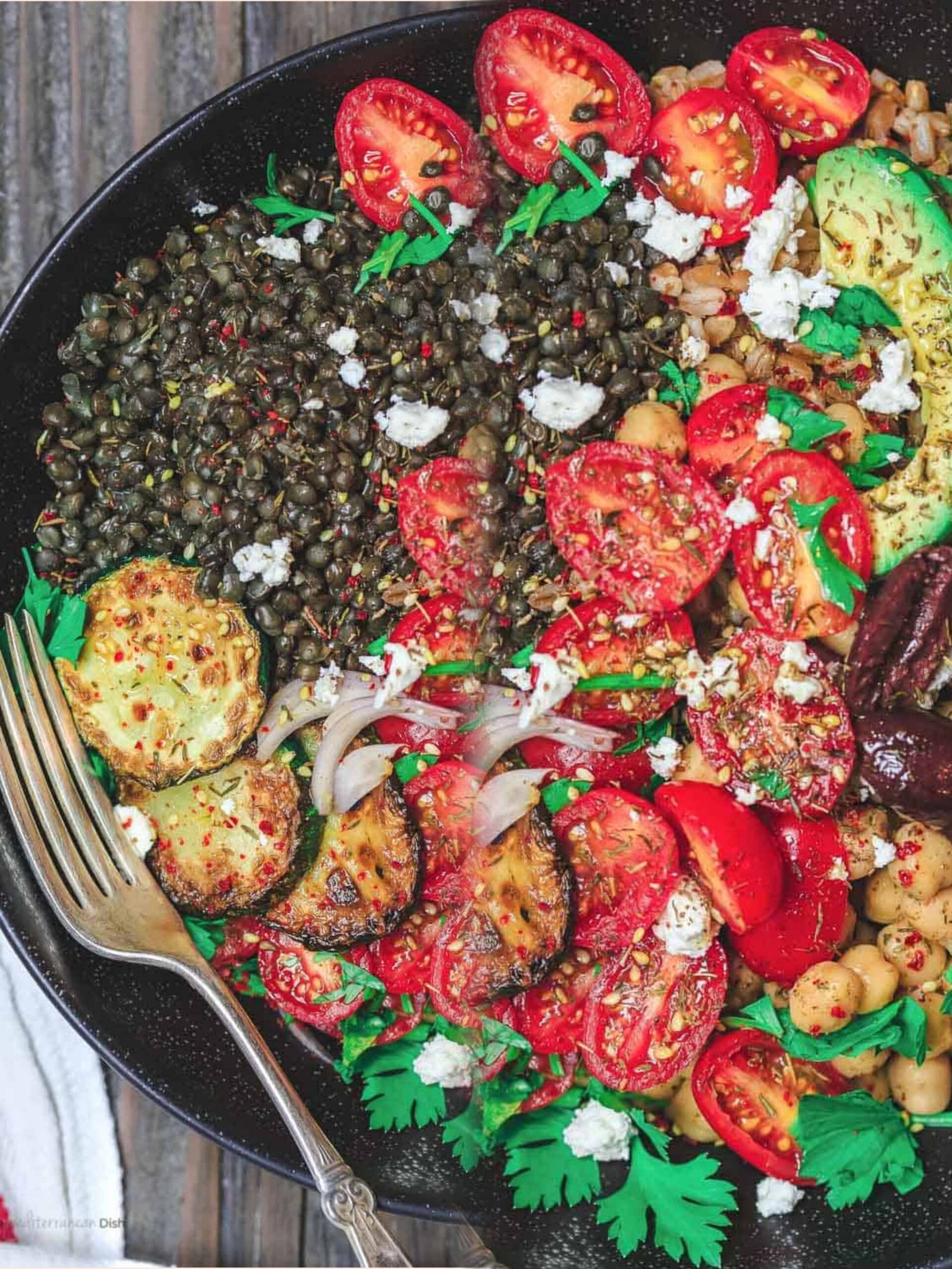 Mediterranean style grain bowls recipe with lentils and chickpeas