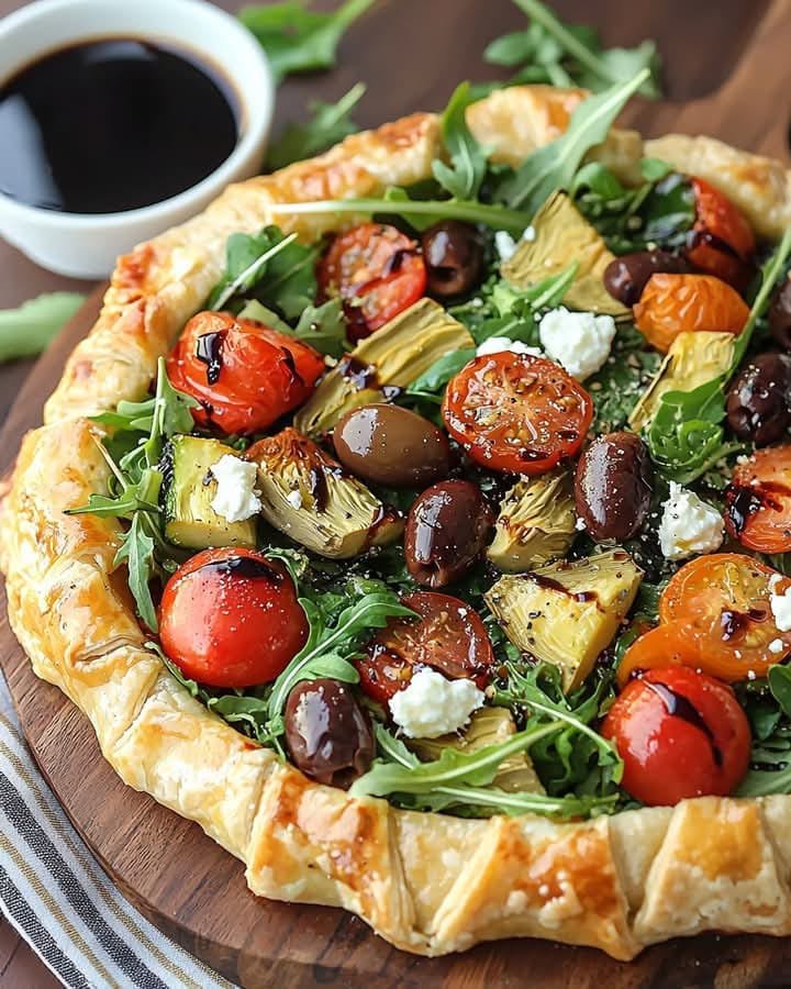 - Assemble the tart: Spread arugula over the baked pastry. Top with roasted tomatoes, artichoke hearts, Kalamata olives, and goat cheese. Drizzle with balsamic glaze.