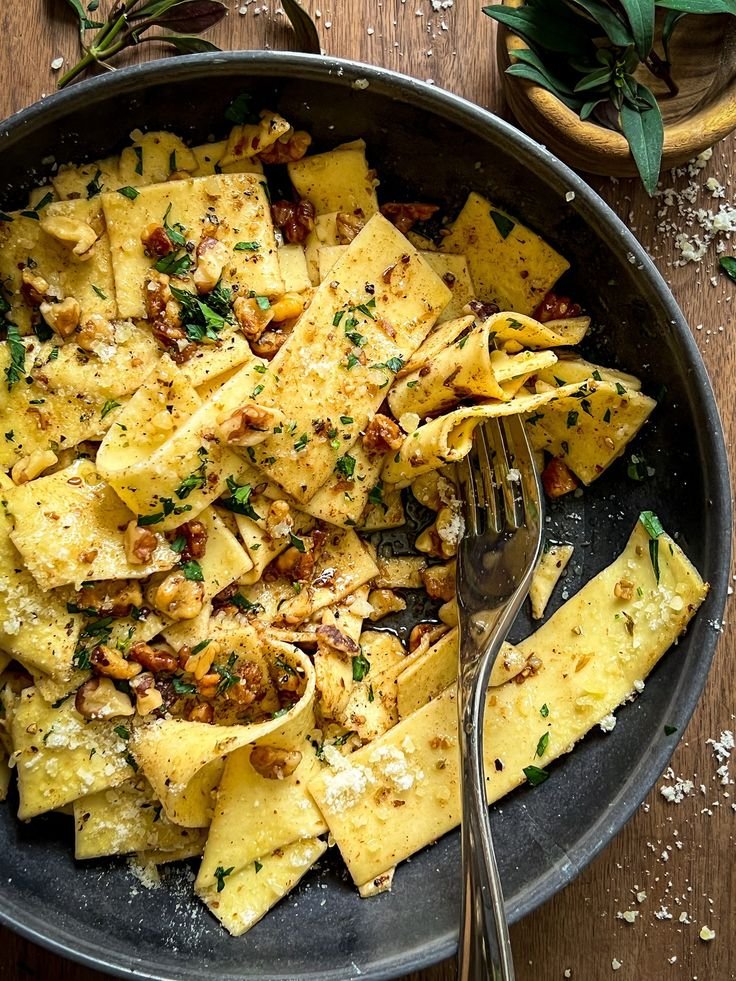 This dish combines wide pasta ribbons with a rich walnut sauce and a generous sprinkle of za’atar, a fragrant Middle Eastern herb blend. It’s earthy, nutty, and herby — perfect for a quick weeknight dinner or an impressive Mediterranean-inspired meal.
