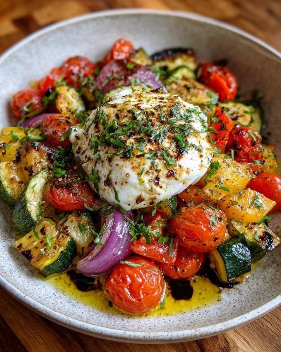 This Mediterranean Warm Burrata & Herb Roasted Veggie Bowl is a comforting yet light dish that brings together creamy burrata and flavorful roasted vegetables seasoned with classic Mediterranean herbs. The contrast between the warm, caramelized veggies and the cool, silky burrata makes it both simple and elegant—perfect as a satisfying lunch, appetizer, or side for grilled meats.