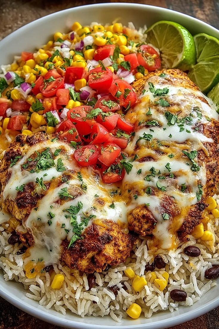 This dish combines juicy spiced chicken, fluffy Mexican rice, and a drizzle of light, creamy queso sauce.It’s a one-pan comfort meal that’s cheesy, satisfying, and still balanced — perfect for a quick weeknight dinner or meal prep bowl.