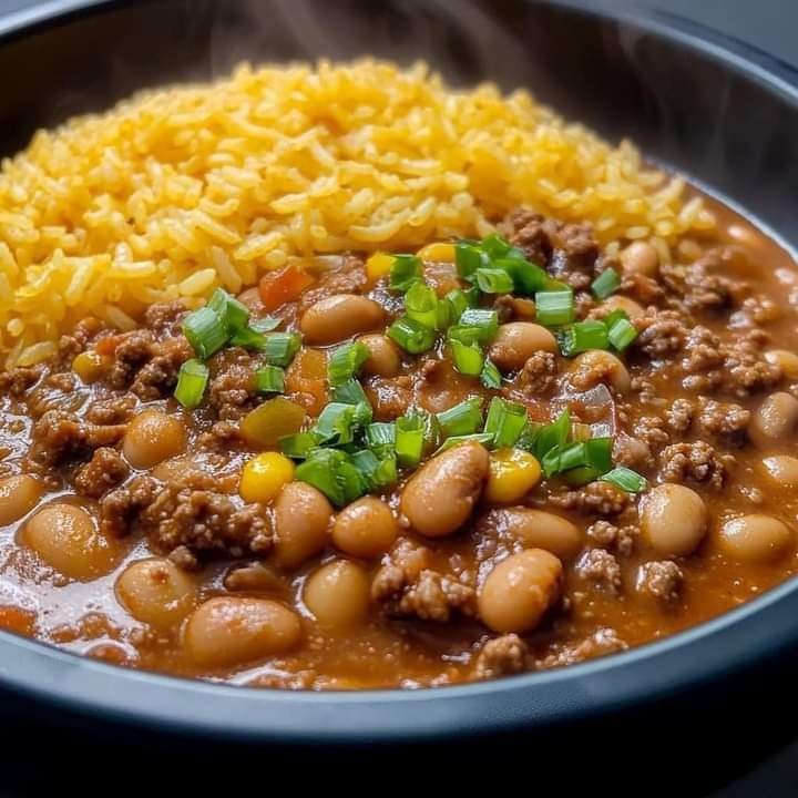 Plate the chili beans with a side of Spanish rice. Enjoy this hearty and flavorful Mexican-inspired meal!