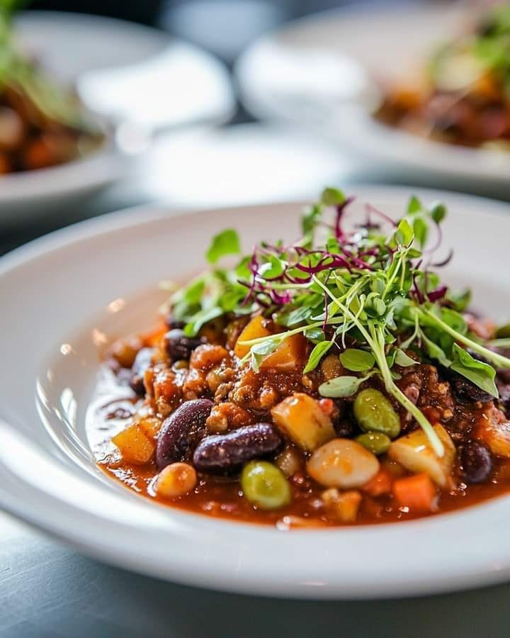Serve: Ladle chili into bowls, garnish with fresh microgreens for a pop of color and flavor.