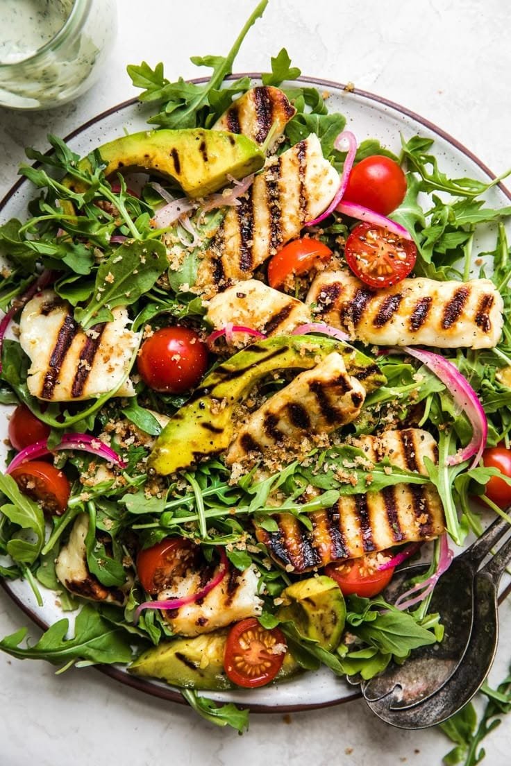 Make it vegan: Swap halloumi for grilled marinated tofu.