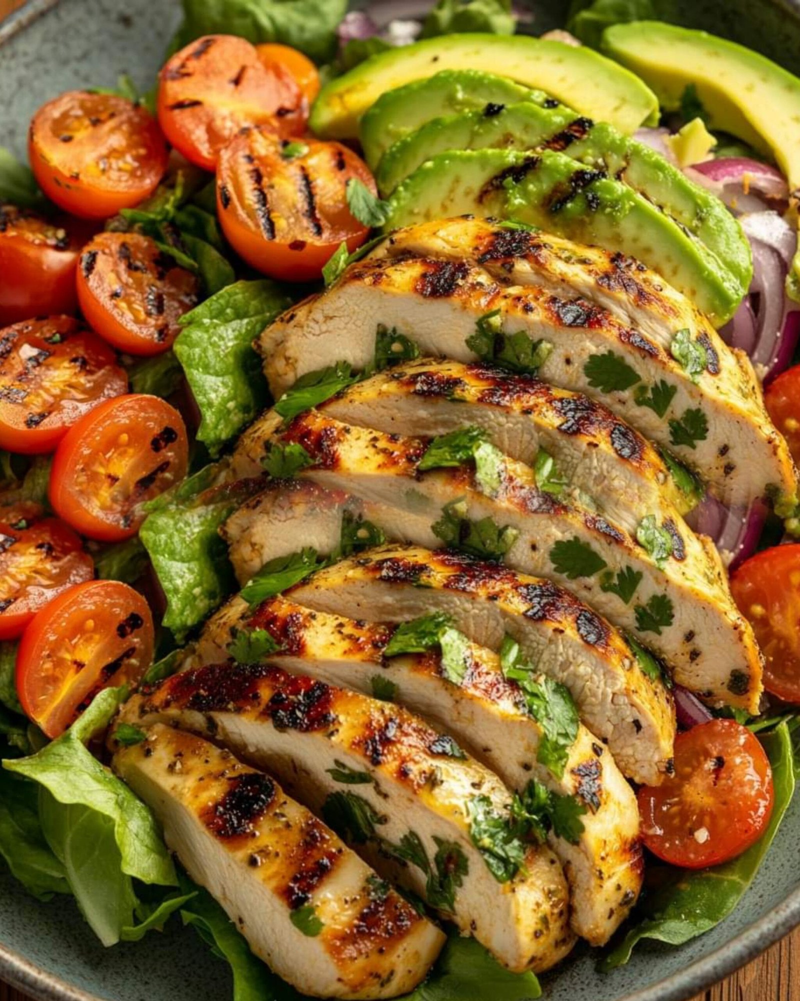 “Mojo Grilled Chicken with Fresh Salad” features tender chicken breasts marinated in a zesty mojo sauce made with garlic, citrus juices, and fresh herbs, then grilled to perfection, offering a smoky and tangy flavor. The chicken is paired with a vibrant, crisp salad composed of mixed greens, ripe tomatoes, crunchy cucumbers, and red onions, all tossed in a light vinaigrette, creating a refreshing contrast to the savory chicken. This dish is a delicious blend of bold and fresh flavors, perfect for a light yet satisfying meal.