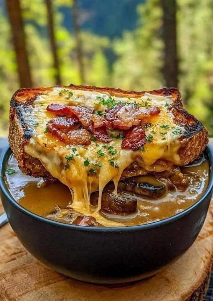 This Mushroom & Caramelized Onion Soup with Cheesy Toasties and Beef is the ultimate comfort dish, combining deep savory flavors, creamy cheese pulls, and hearty textures. Whether served as a weekend dinner or a cozy lunch, it satisfies on every level — rustic, rich, and soul-hugging. One bite and you’ll be transported to a warm cabin in the woods.
