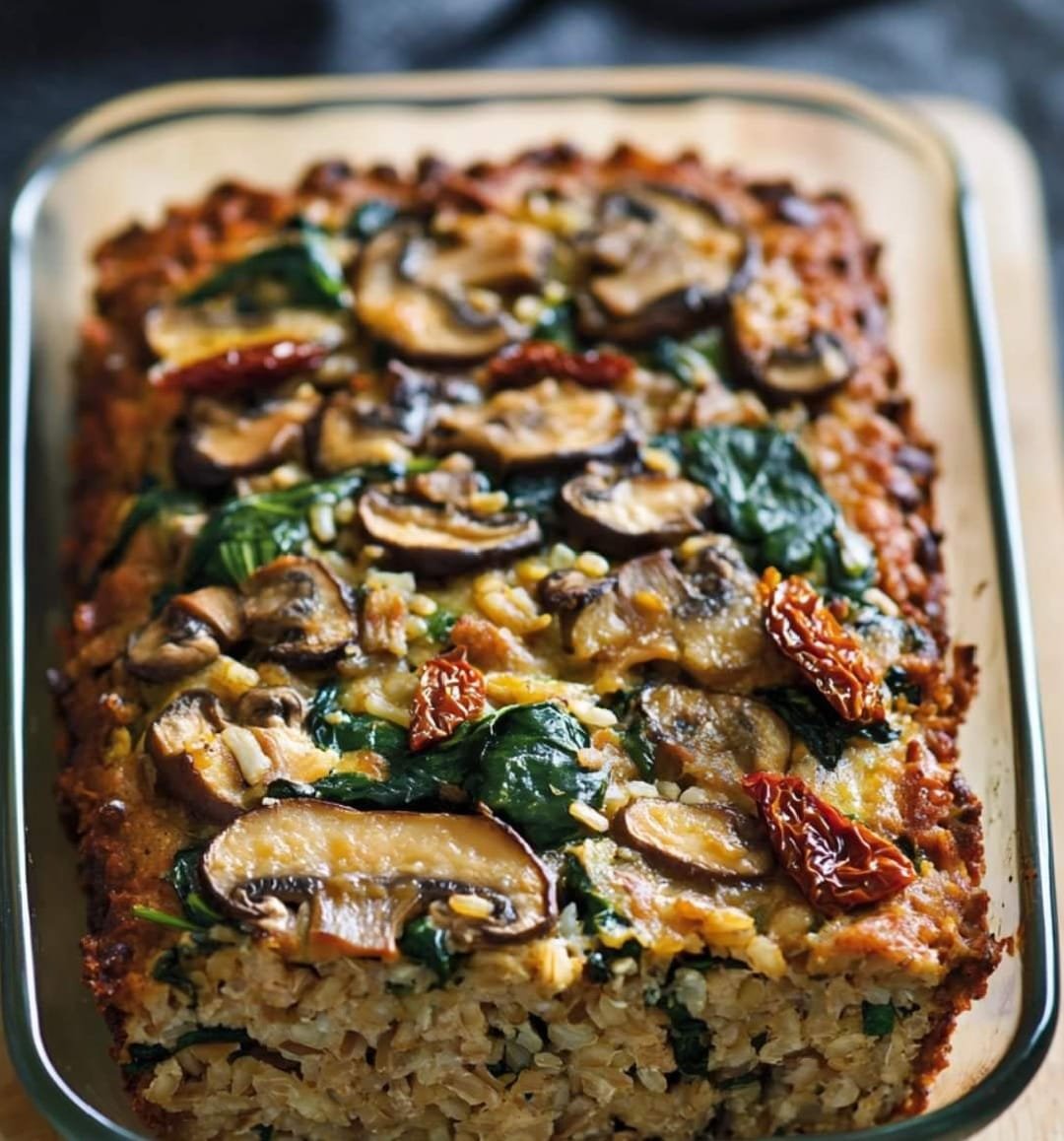 The Mushroom Spinach and Brown Rice Loaf is a hearty, nutritious dish that combines earthy mushrooms, fresh spinach, and wholesome brown rice into a satisfying loaf. This meatless option is packed with flavor and can serve as a main dish or a side. The texture is moist and dense, thanks to the rice and sautéed vegetables, while herbs and spices add depth to each bite. It can be served warm or cold, making it versatile for any meal.