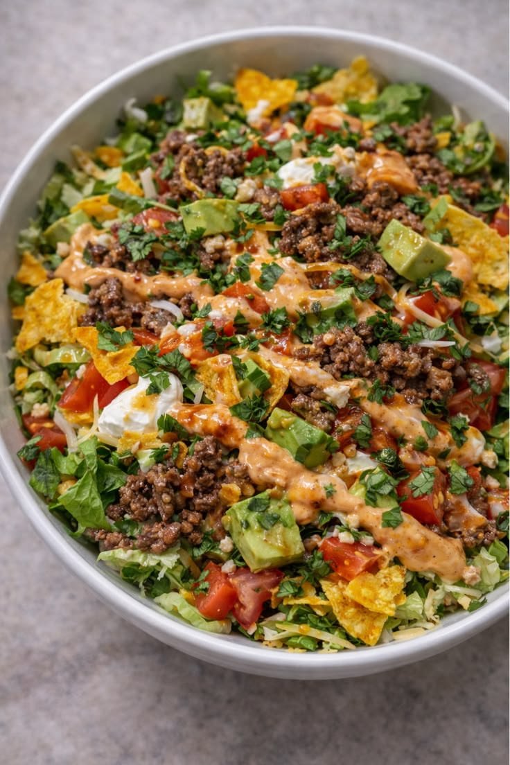 A Nacho Salad Bowl is a fun, hearty dish that combines the bold flavors of nachos with the freshness of a salad. Instead of layering everything on chips, the ingredients are served in a bowl with crisp lettuce, seasoned meat or beans, crunchy tortilla chips, fresh vegetables, cheese, and a creamy dressing.This meal is perfect for quick dinners, parties, or customizable family meals because everyone can add their favorite toppings.