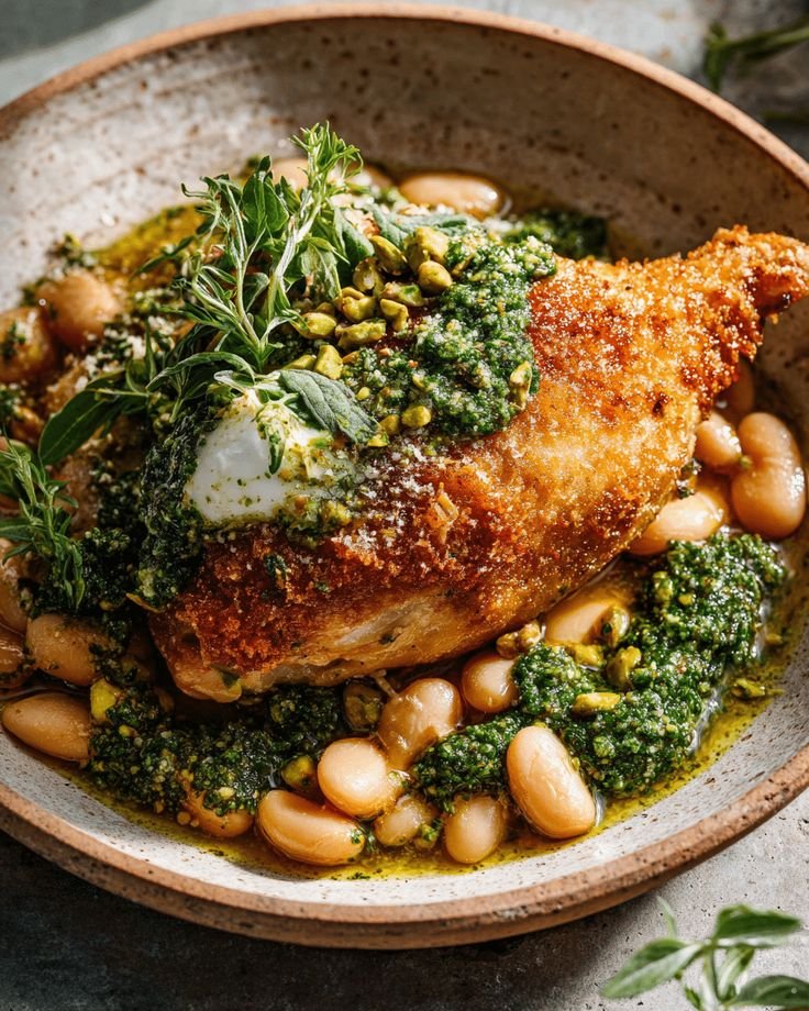 Crispy golden chicken cooked in one pan alongside creamy cannellini beans, finished with vibrant pistachio pesto.This dish is protein-rich, Mediterranean-friendly, and combines comforting roasted flavors with a fresh herby twist. Perfect for a diet-conscious festive meal.