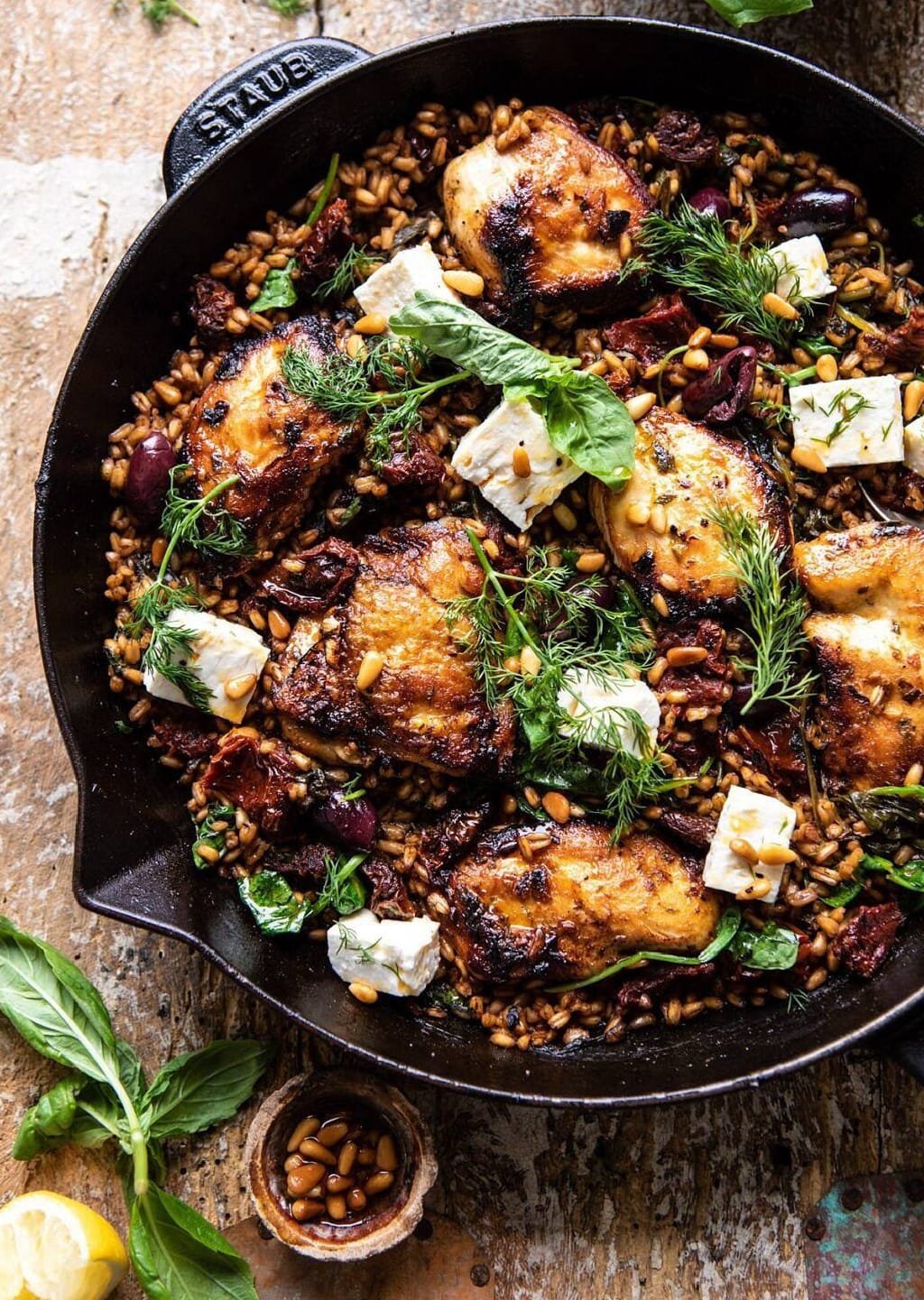 The best One Skillet Greek Sun-Dried Tomato Chicken and Farro…because it’s true, skillet dinners are the BEST. Greek seasoned chicken with fresh oregano, dill, garlic, lemon, and paprika, pan seared and cooked with healthy farro, sun-dried tomatoes, and olives for a delicious all in one skillet dinner. It’s quick, simple, easy, healthy, and delicious. Finish off with a little feta cheese and toasted pine-nuts, for a true Greek inspired dinner that everyone will love.
