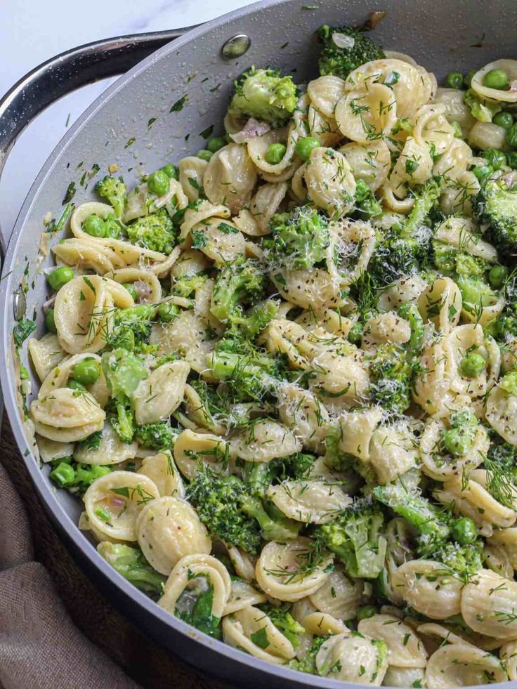 This dish is inspired by Southern Italian Mediterranean cooking, where orecchiette (“little ears”) catch the sauce beautifully. Tender broccoli and sweet peas are tossed with garlicky olive oil, finished with cheese for creaminess. It’s light, balanced, and perfect for a wholesome lunch or dinner.