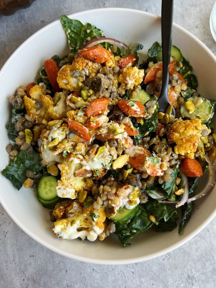 Nourishing roasted cauliflower lentil and cucumber salad with tazatki sauce