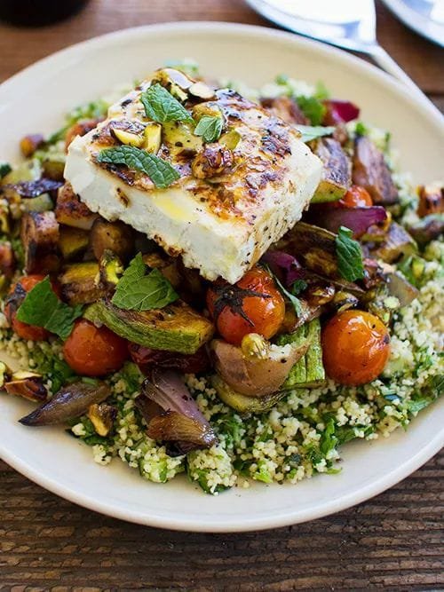 Grilled vegetables salad with feta and tabbouleh